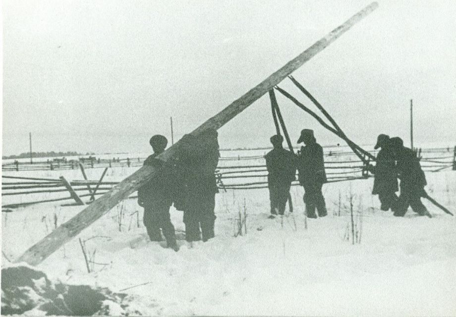 Установка опоры ЛЭП в годы войны