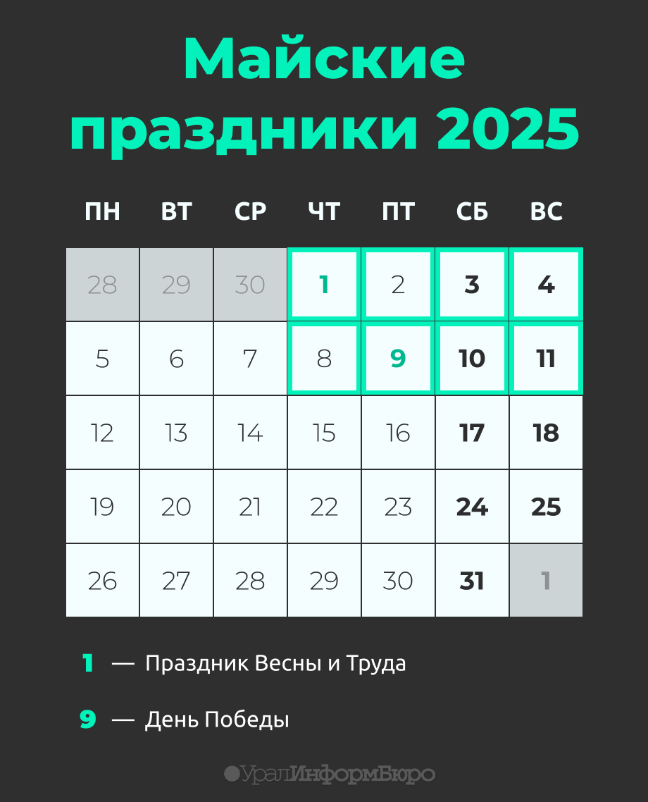 Из-за праздников россияне, которые по графику работают с понедельника по пятницу, в мае 2025 года будут трудиться всего 18 дней. К тому же их ждут две трехдневные рабочие недели – в конце апреля и начале мая.