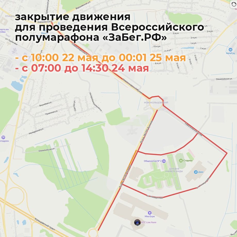 На время проведения самого забега – с 07.00 до 14.30 24 мая – закроют бульвар Экспо, улицу Универсиады, Новосинарский бульвар и улицу 100-летия Уральского университета.