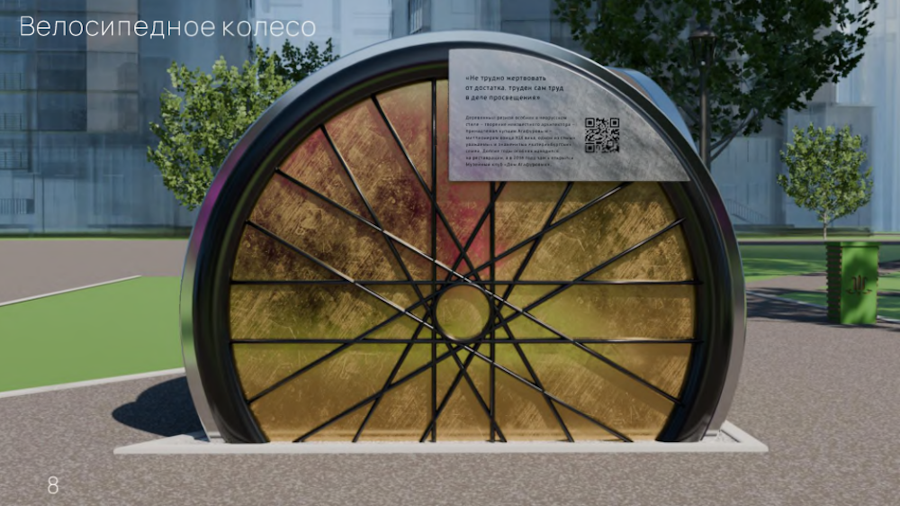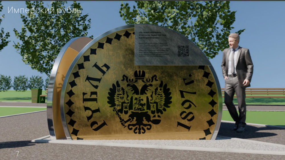 Символика, заложенная в арт-объектах, довольно прозрачна. Так, российский рубль напоминает о "времени расцвета фамилии Агафуровых, активно и деятельно служивших процветанию города", а колесо – о вкладе бизнесменов в развитие велосипедного и конькобежного спорта в Екатеринбурге.