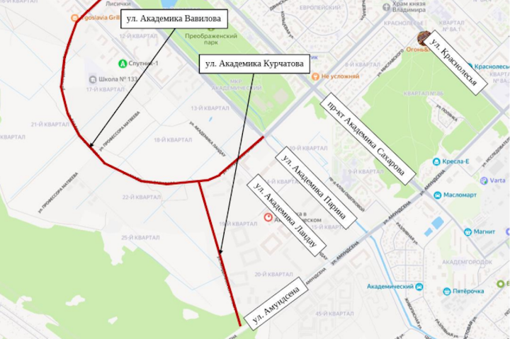 Также в постановлении мэрии утверждены трассировки улиц, названных в честь академиков Игоря Курчатова и Николая Вавилова. Они появятся в строящейся части Академического на территории 17-го, 18-го, 19-го и 20-го кварталов и соединят их с улицей Амундсена.