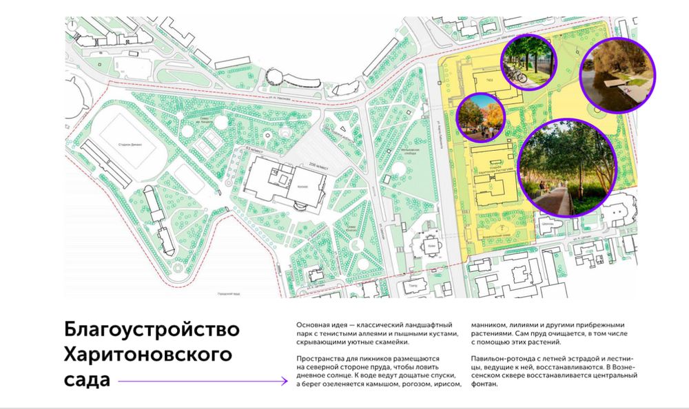 По проекту планируется благоустроить Харитоновский парк, озеленить берег пруда, очистить пруд, а также восстановить павильон-ротонду с летней эстрадой и центральный фонтан.