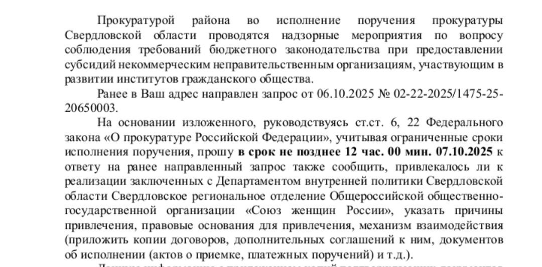 В распоряжении редакции оказался документ, направленный надзором в департамент внутренней политики Свердловской области (до ареста его курировал Олег Чемезов). К полудню 7 октября чиновники должны предоставить полный пакет документов, связанных с выделением субсидий, к которым имел отношение областной "Союз женщин России". В частности, ведомство требует сообщить причины привлечения организации к выполнению соглашений, правовые основания для этого и механизм взаимодействия.