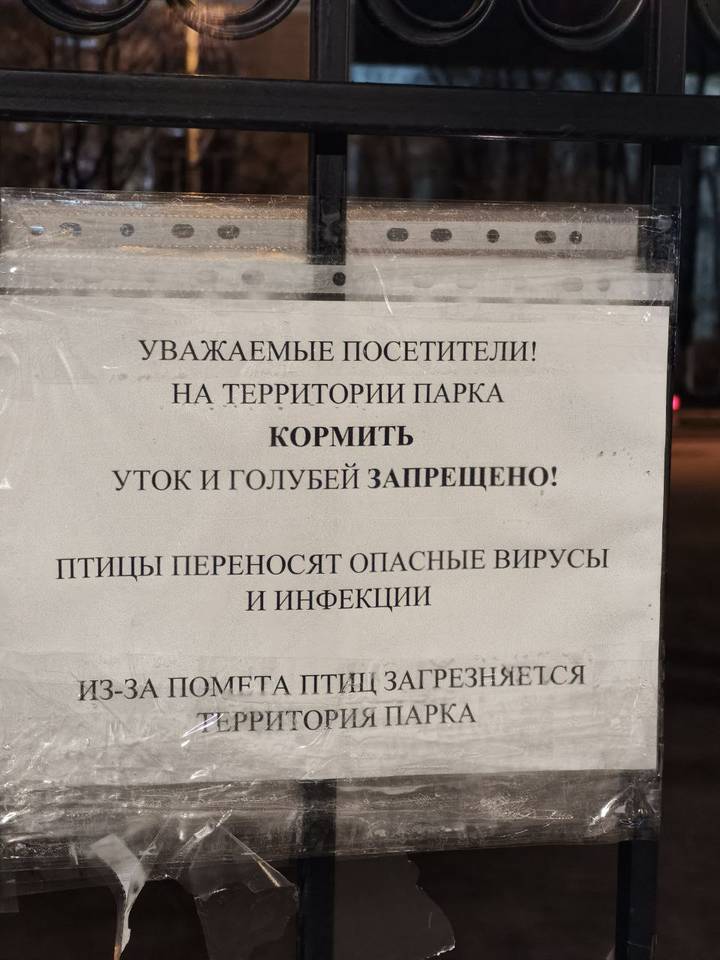 "Уважаемые посетители! На территории парка кормить уток и голубей запрещено! Птицы переносят опасные вирусы и инфекции. Из-за помета птиц загрязняется территория парка", – гласят объявления, развешенные на оградах.