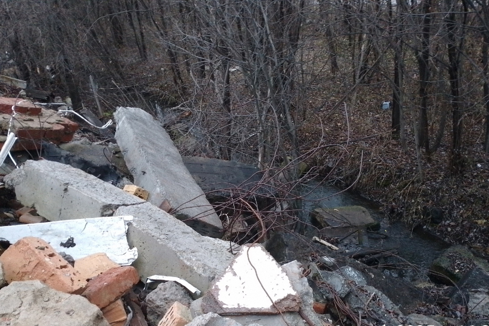 Горы строительных отходов нависают над руслом реки Широкой. Фото: Елена Кольцова
