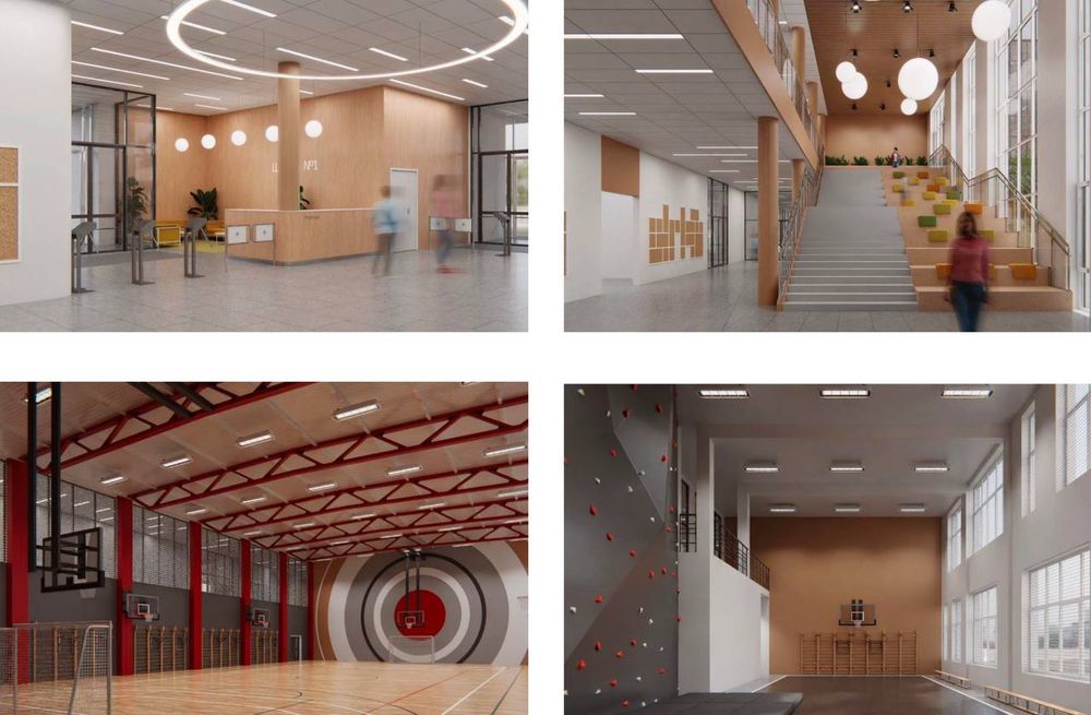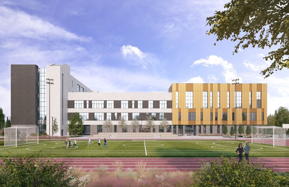 Трехблочное здание вместит отдельные корпуса для начальной и старшей школы, библиотеку, столовую на 600 мест и актовый зал такой же вместимости. На территории школы оборудуют физкультурно‑спортивную зону с многофункциональным кортом для футбола и хоккея, площадками для баскетбола и волейбола, беговыми дорожками, прыжковой ямой и трибунами для зрителей.