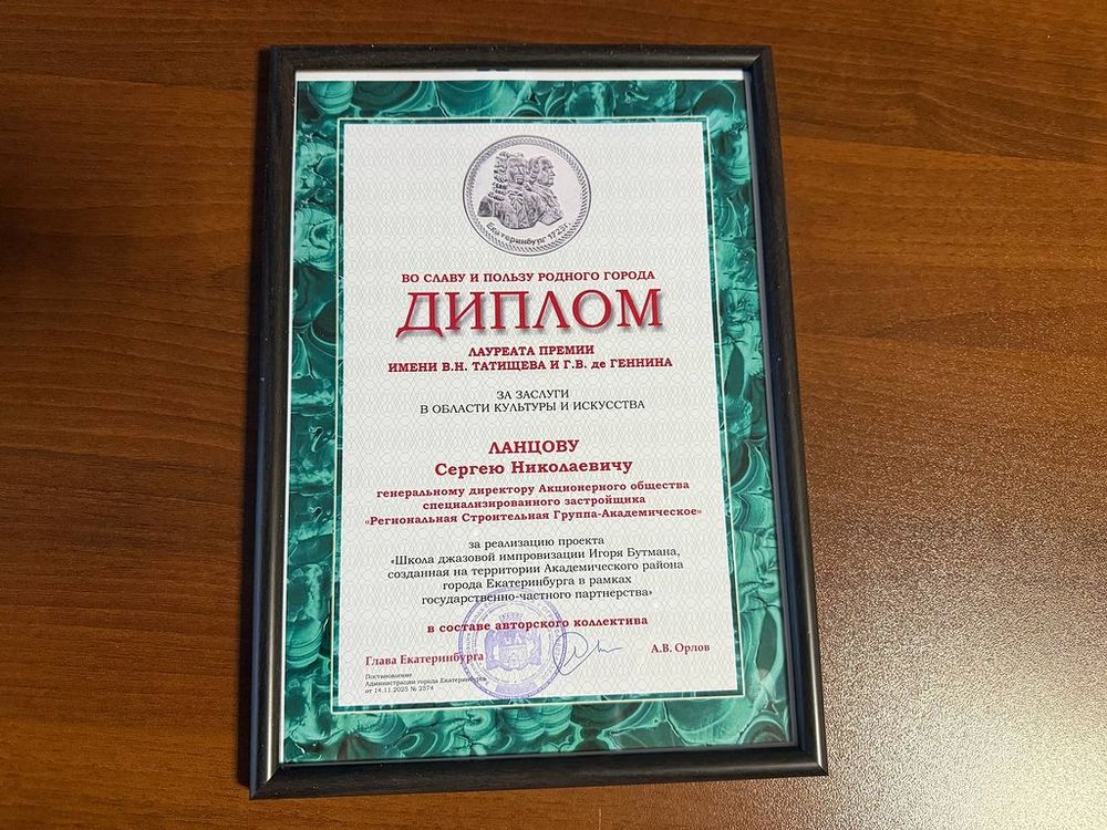 В номинации "За заслуги в области культуры и искусства" победителем стал проект "Школа джазовой импровизации Игоря Бутмана", реализуемый на базе Екатеринбургской детской школы искусств № 6 имени К.Е.Архипова при поддержке АО СЗ "РСГ-Академическое" (входит в ГК "КОРТРОС"). Награды получили народный артист РФ Игорь Бутман, генеральный директор АО СЗ "РСГ-Академическое" Сергей Ланцов и директор ЕДШИ №6 Евгения Серебренникова.