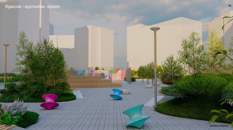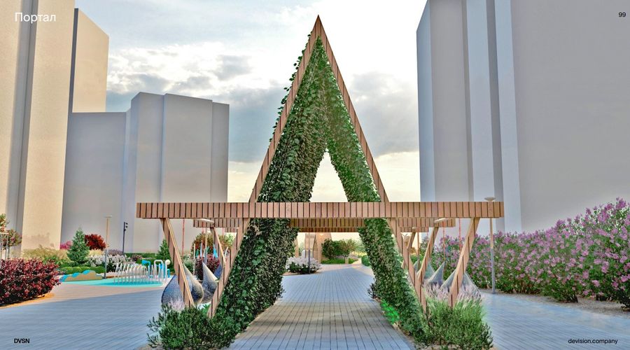 Центром притяжения станет портал в форме буквы "А" с креслами-коконами по бокам – эффектная архитектурная доминанта и новая фотозона района.