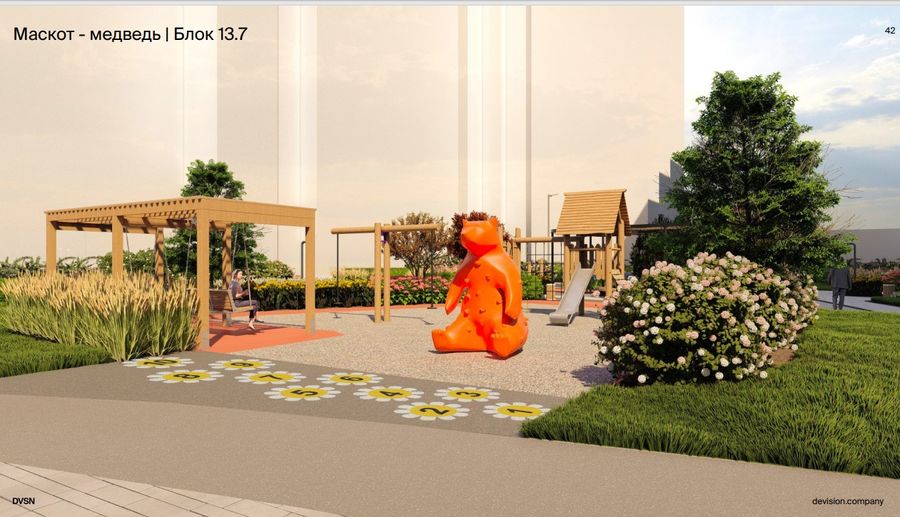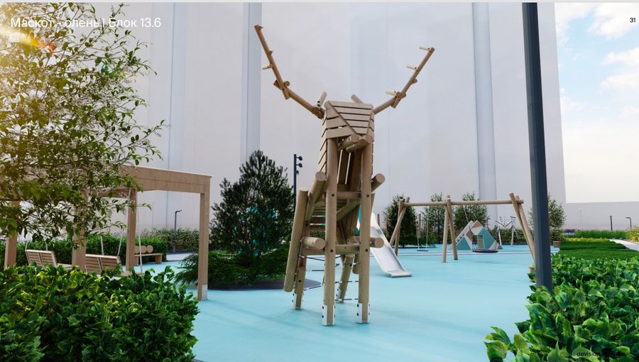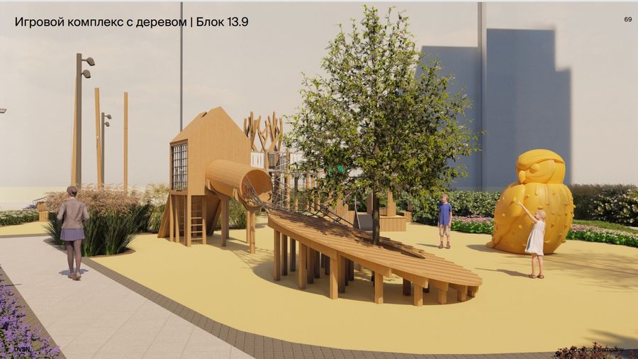 Средний Урал будет представлен через образы деревянного зодчества: игровые конструкции будут выполнены из дерева, а главной особенностью станет скалодром-медведь. В летний зной прохладу подарят тенистые уголки.