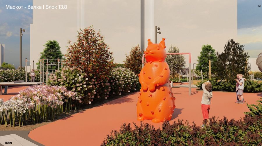 Индустриальный Восточный Урал ассоциируется с металлургией и производствами, поэтому основными материалами для этого двора выбраны металл и бетон. Там же появятся скалодром в виде бельчонка и первый в Академическом районе общественный огород, заложенный еще на стадии проектирования. Он станет новым форматом взаимодействия жителей с пространством и природой.