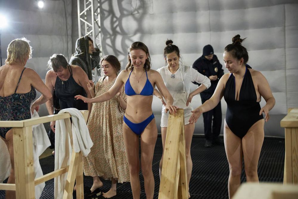 Окунуться в крещенскую воду, несмотря на поздний час, пришли десятки верующих, многие – семьями, с детьми. Одновременно опуститься в купели, температура воды в которых составляет около +5 градусов, могут четыре человека. Организовывать потоки людей помогают сотрудники службы безопасности, народные дружинники и волонтеры.
