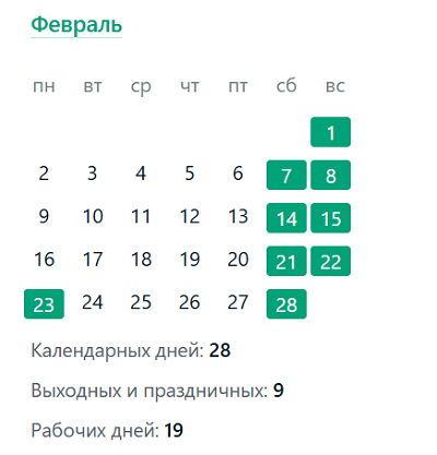 Так как День защитника Отечества выпадает на понедельник, выходными будут три дня подряд – с 21 по 23 февраля включительно. Таким образом, для тех, кто работает в режиме пятидневной недели, 19 дней месяца будут рабочими, а остальные 9 – выходными (с учетом праздника).