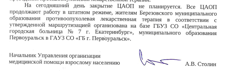 Без доступной химиотерапии уже остались пациенты Березовского. В ответе на запрос нашей редакции ведомство Савиновой было вынуждено это признать. Противоопухолевую терапию им перенесли в екатеринбургскую ЦГБ № 7. При этом, по информации инсайдеров, в самой "семерке" запись на химиотерапию после 31 марта не ведется.
