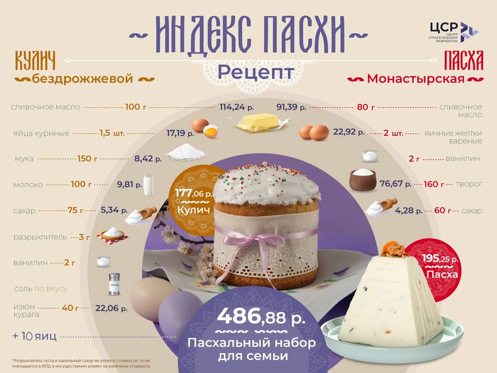 "Средняя цена продуктов для приготовления блюд пасхального стола в 2026 году на семью в России составила 486 рублей 88 копеек. Вслед за масленичной дефляцией фиксируется пасхальная – стоимость набора продуктов в среднем по стране снизилась на 1,7% по отношению к прошлогоднему индексу Пасхи", – отмечают аналитики.