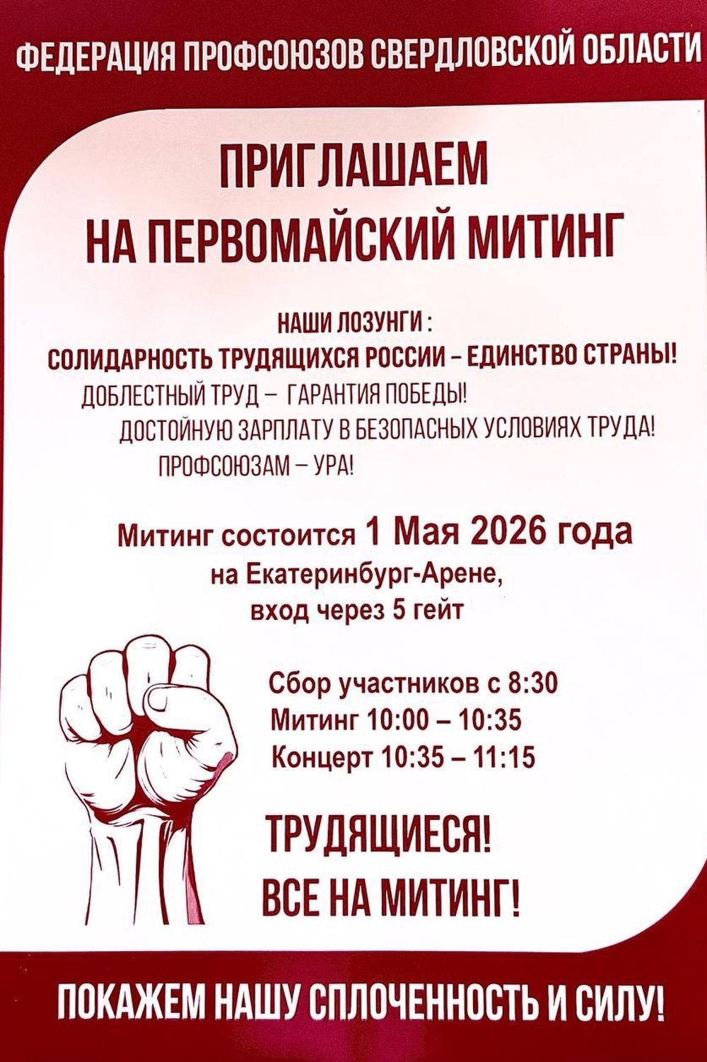 Вместо демонстрации профсоюзов 1 мая в Екатеринбурге состоится митинг. Об этом в своих соцсетях сообщил председатель Федерации профсоюзов Свердловской области Андрей Ветлужских.