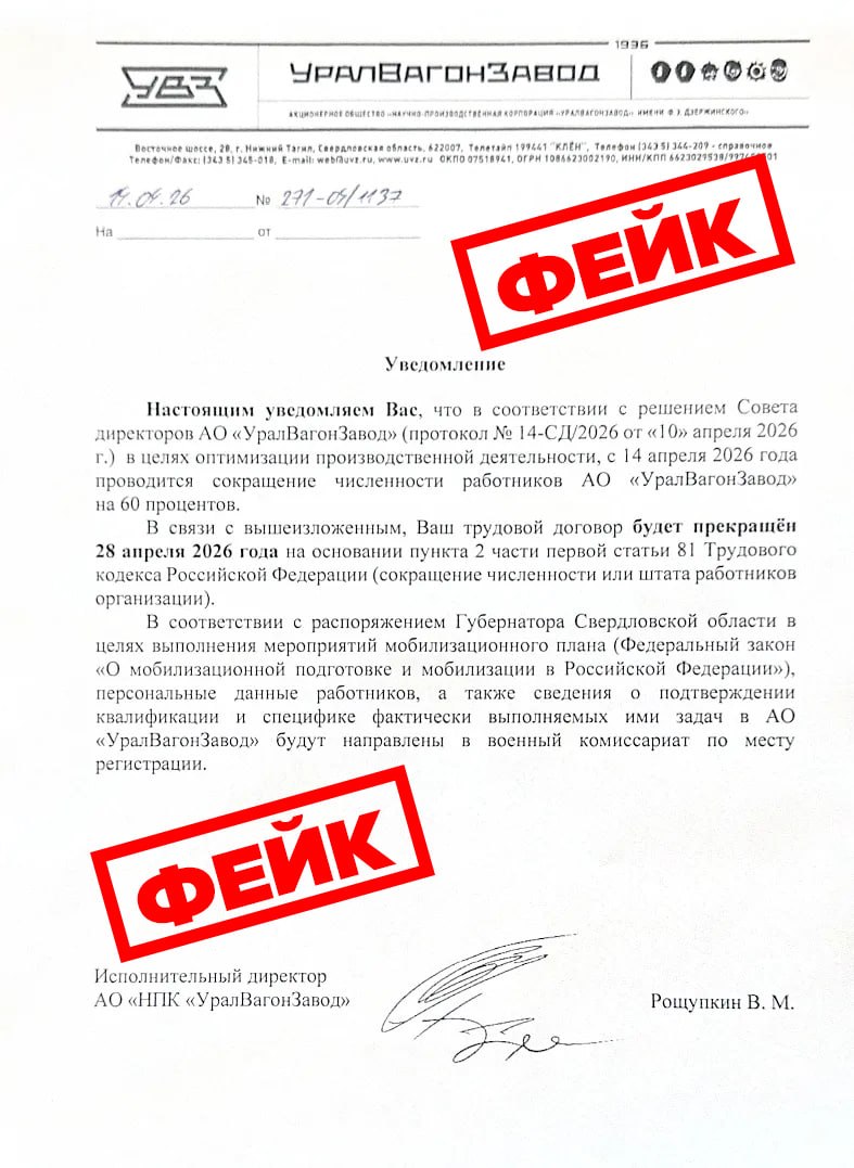 Рассылаемое по соцсетям уведомление о масштабных сокращениях на Уралвагонзаводе – фейк. Об этом предупредила пресс-служба предприятия.