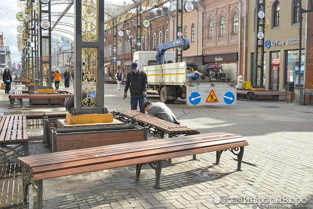 В центре Екатеринбурга началась подготовка к реконструкции улицы Вайнера. Днем 23 апреля рабочие начали убирать оттуда скамейки.