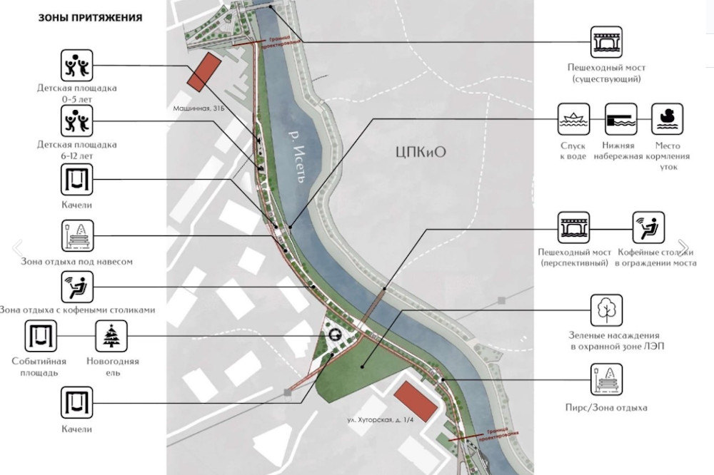 Ядром территории станет событийная площадь с качелями. Для связи с левым берегом Исети построят пешеходный мост, установят навигационные указатели и информационные стенды, рассказывающие об истории места. Также предусмотрена возможность размещения торговых точек и кафе, а в зимнее время – новогоднего городка.