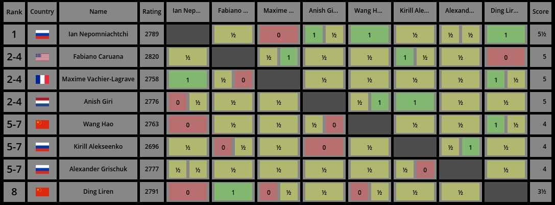 Второе место, отставая от Непомнящего на 0,5 очка, делят американец Фабиано Каруана, француз Максим Вашье-Лаграв и нидерландец Аниш Гири. Первые двое свои партии накануне сыграли вничью, последний одержал победу над китайцем Ван Хао.