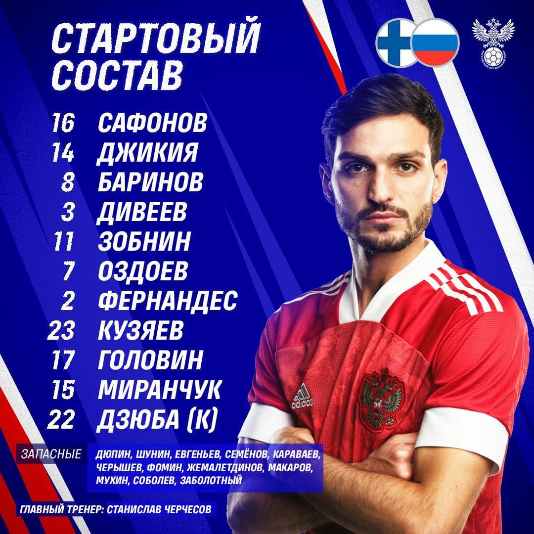 В целом стартовый состав россиян выглядит следующим образом: Матвей Сафонов, Георгий Джикия, Дмитрий Баринов, Игорь Дивеев, Роман Зобнин, Магомед Оздоев, Марио Фернандес, Далер Кузяев, Александр Головин, Алексей Миранчук и Артем Дзюба (капитан).