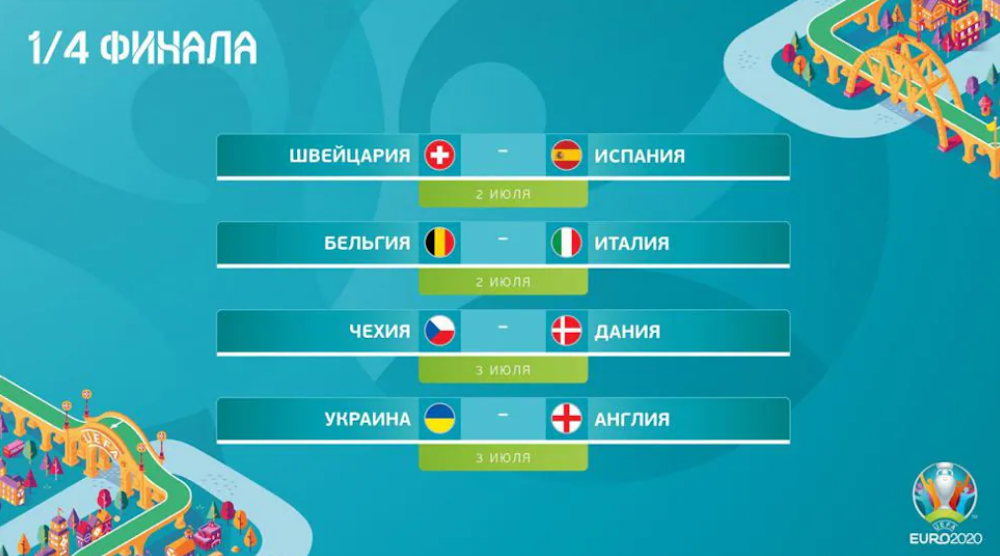 Также за путевки в полуфинал поборются Швейцария и Испания, Бельгия и Италия, Чехия и Дания. Матчи пройдут 2-3 июля.