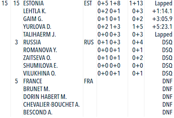 На Олимпиаде 2014 года российские биатлонистки Ольга Зайцева, Яна Романова, Ольга Вилухина и Екатерина Шумилова стали вторыми в эстафете, уступив только команде Украины. Спустя несколько лет Зайцеву, Романову и Вилухину обвинили в нарушении антидопинговых правил и пожизненно дисквалифицировали. В сентябре 2020 года Романова и Вилухина были оправданы, но решение по Зайцевой осталось в силе, поэтому вся команда была лишена серебряных медалей.