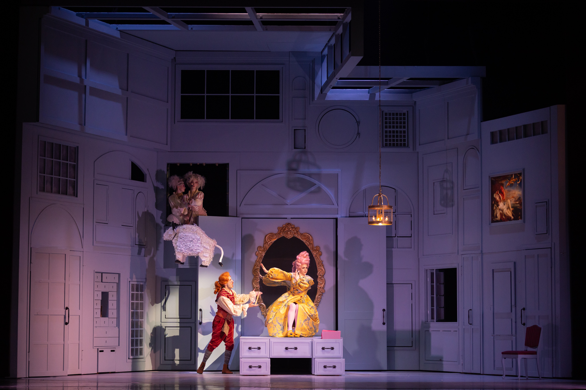 Среди декораций, например, есть картина "Похищение Европы" Тициана. Розина, которая ждет, чтобы ее похитили, бьет пеньяту-быка – это отсылка к мифу и намек, что она готова к похищению, но по своим правилам.