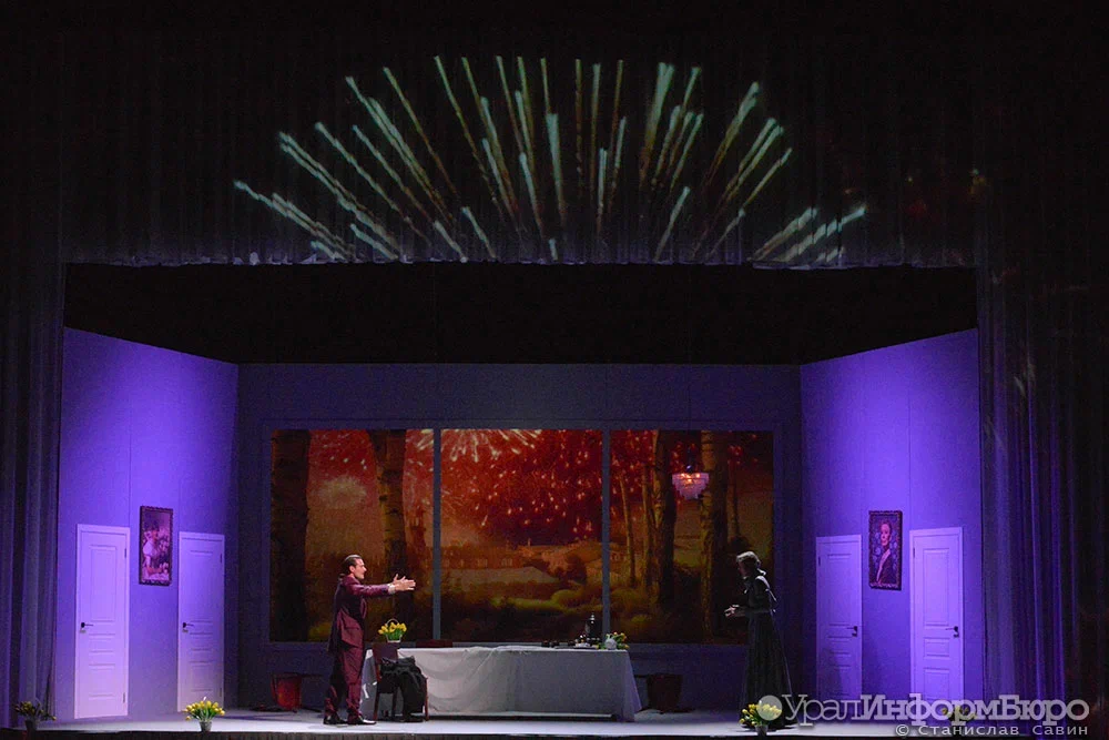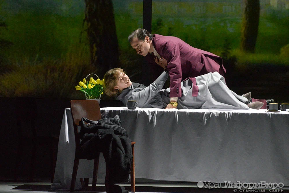 Один из интересных ходов постановки: главная героиня впервые предстает перед зрителями на авансцене, когда на основной сцене заходит речь о том, что она за человек и как возникло ее влияние на мужа. Согбенная и тихая, в темной дорожной одежде, она садится рядом с пианино и сидит, пока о ней рассуждают. Пару раз, когда Кочуев цитирует ее, она сама подает голос, произнося свои слова вместо него: это звучит очень сильно. А когда муж рассказывает, как Ксения отреагировала, узнав о его "грешках в оперетке", над сценой появляется большой экран с глазами героини – серьезные и грустные, они занимают всё пространство.