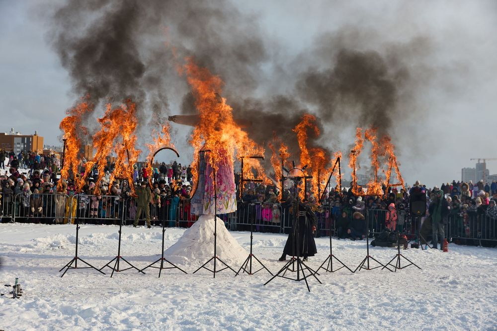 Кульминацией праздника стало традиционное сжигание чучела. После впечатляющего фаер-шоу пламя охватило гигантскую надпись "Масленица" и соломенную куклу, ознаменовав скорый приход весны.